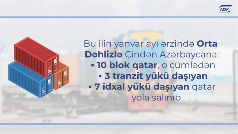 Cari ilin yanvar ayında Çinin Sian vilayətindən Azərbaycan istiqamətində 3-ü tranzit, 7-si idxal yükü olmaqla 10 konteyner blok qatar yola salınıb.