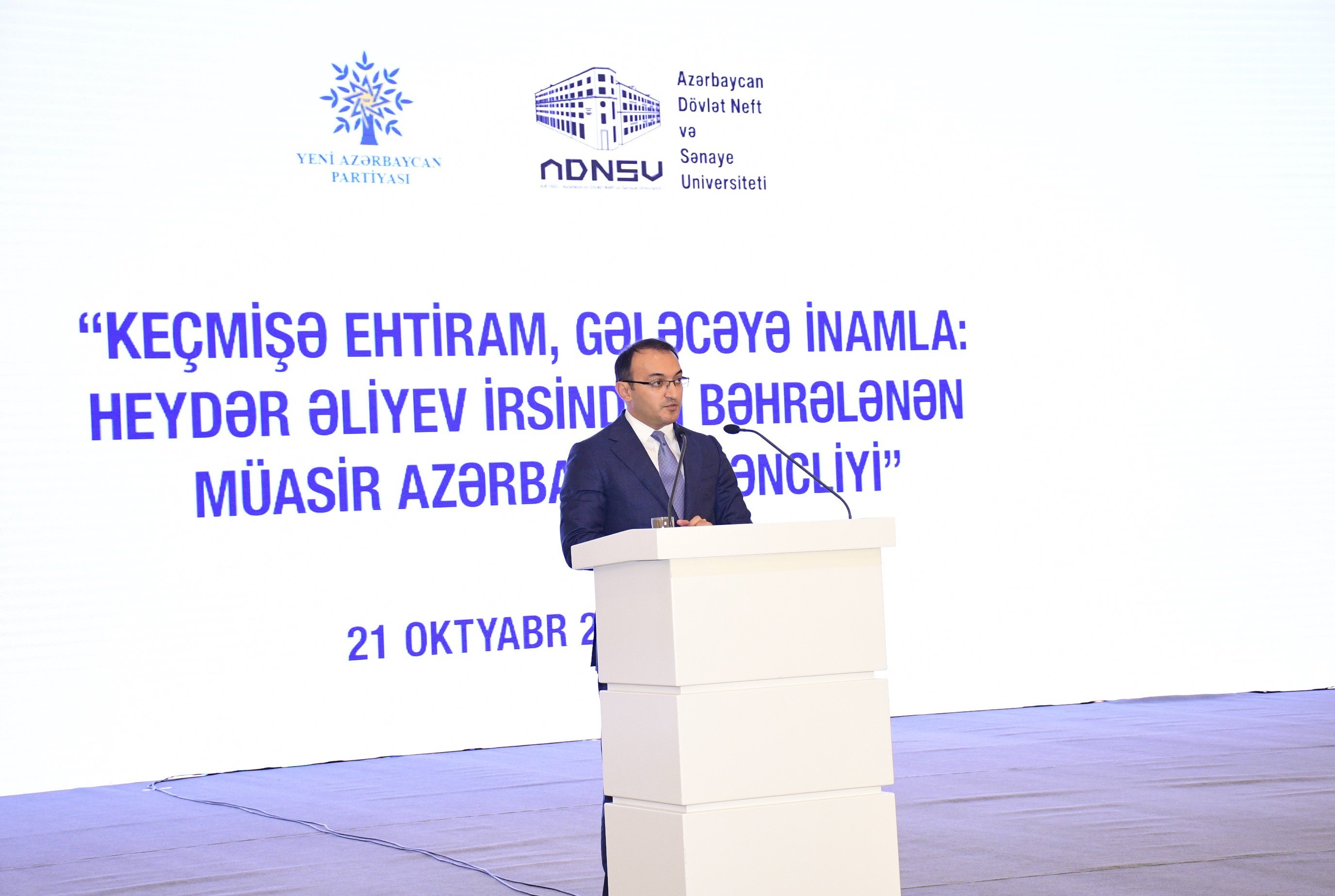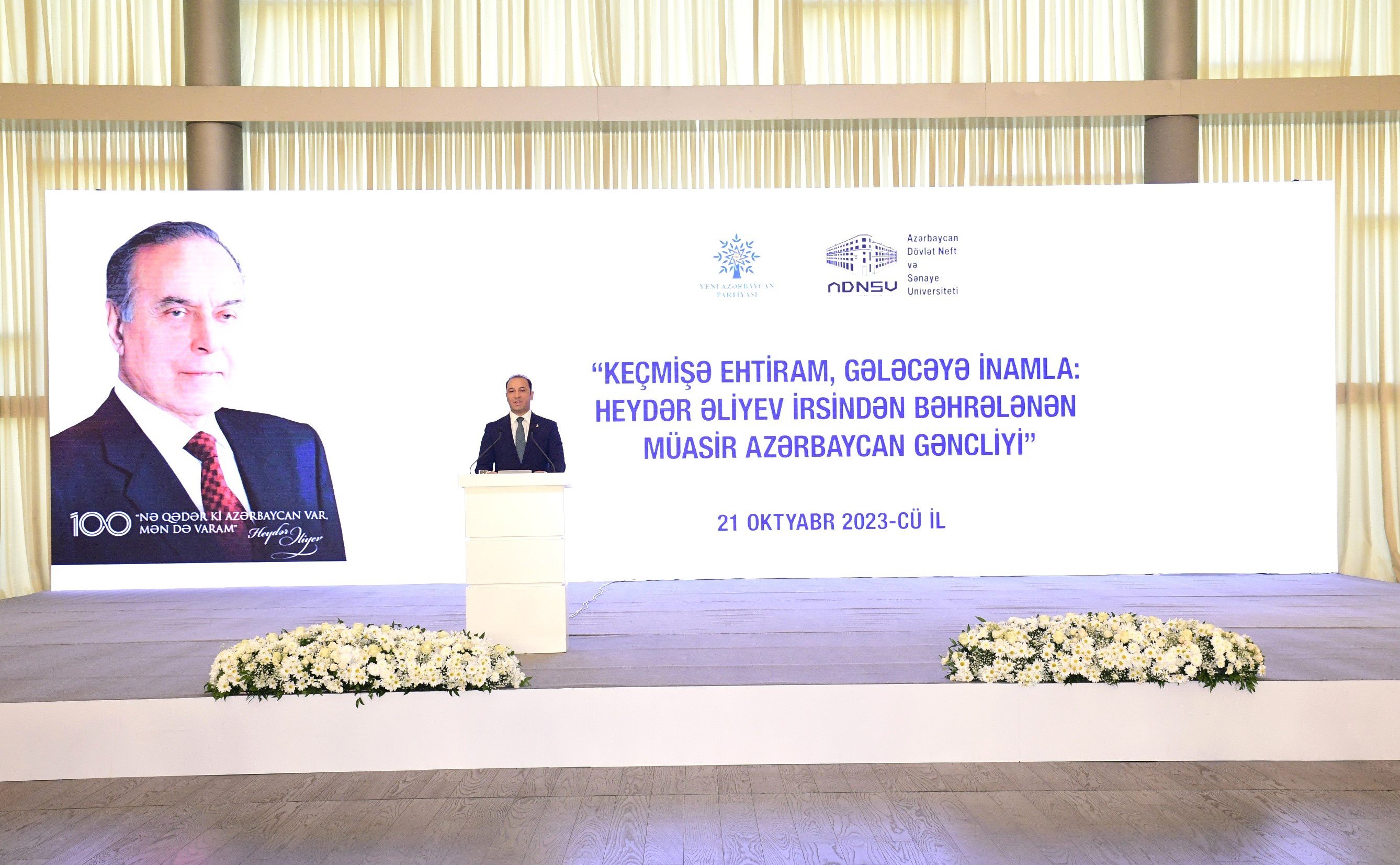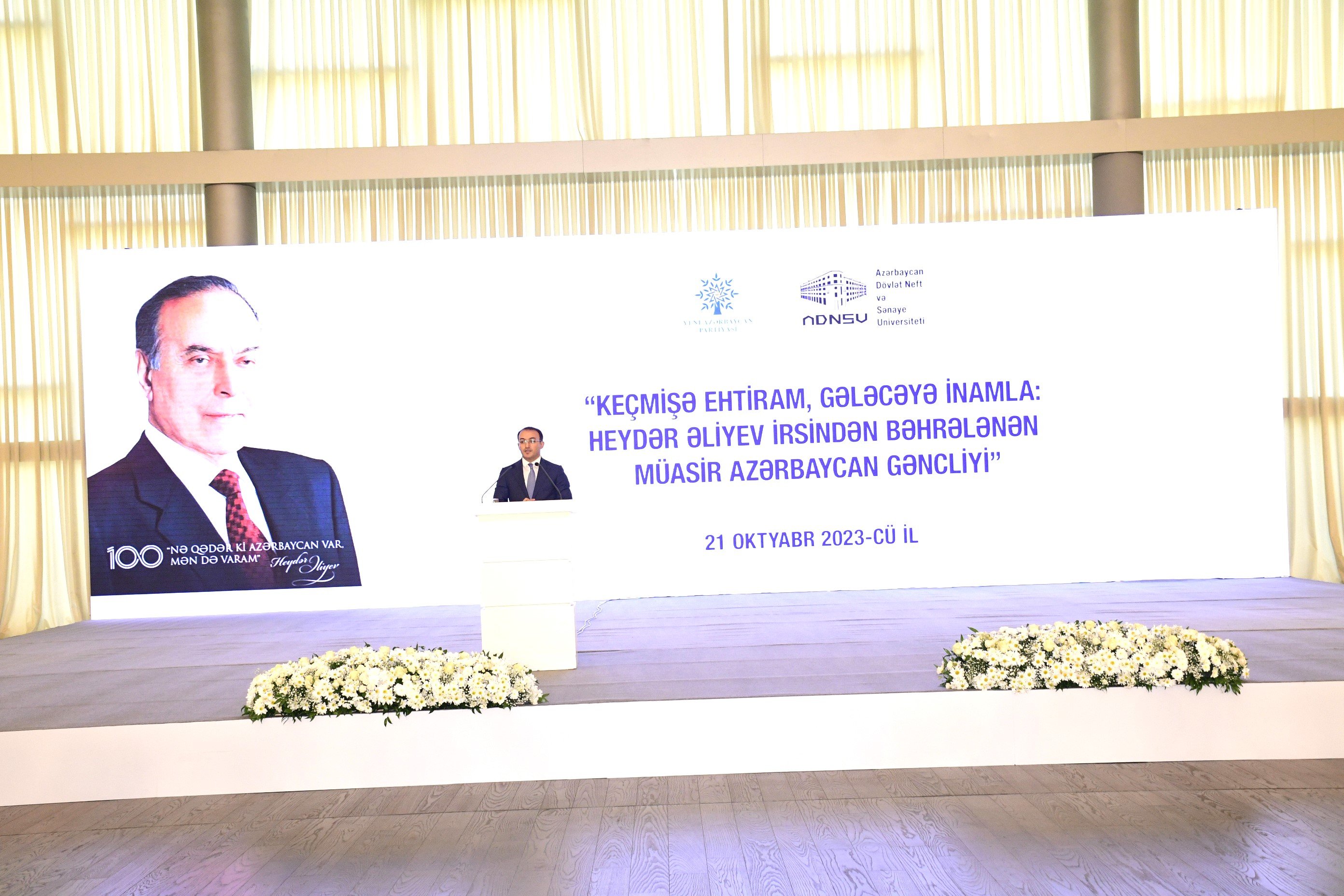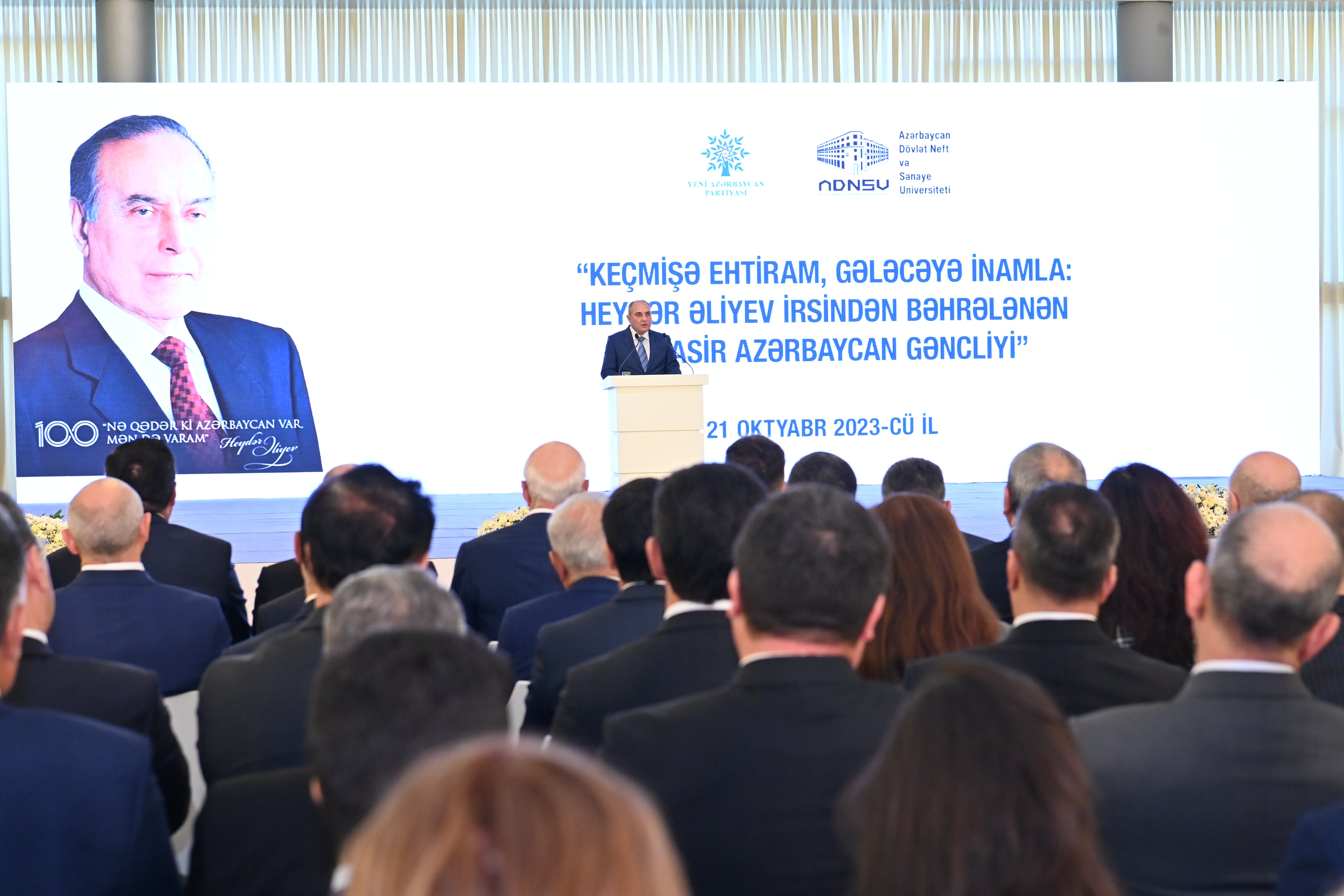 Oktyabrın 21-də Heydər Əliyev Mərkəzində Yeni Azərbaycan Partiyasının (YAP) Mərkəzi Aparatı və Azərbaycan Dövlət Neft və Sənaye Universitetinin (ADNSU) birgə təşkilatçılığı ilə Ümummilli Lider Heydər Əliyevin 100 illik yubileyinə həsr olunmuş “Keçmişə ehtiram, gələcəyə inamla: Heydər Əliyev irsindən bəhrələnən müasir Azərbaycan gəncliyi” mövzusunda tədbir keçirilib.