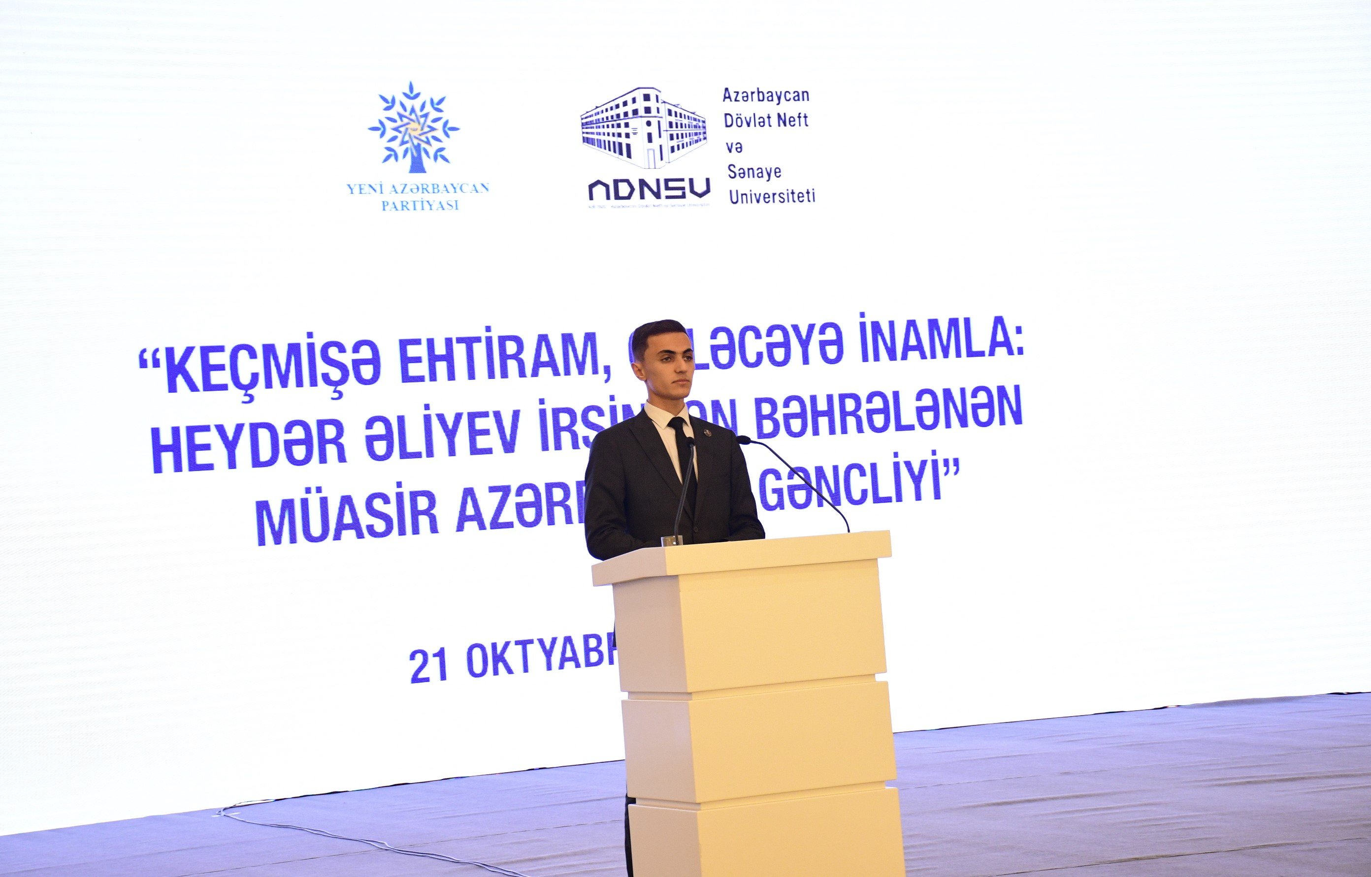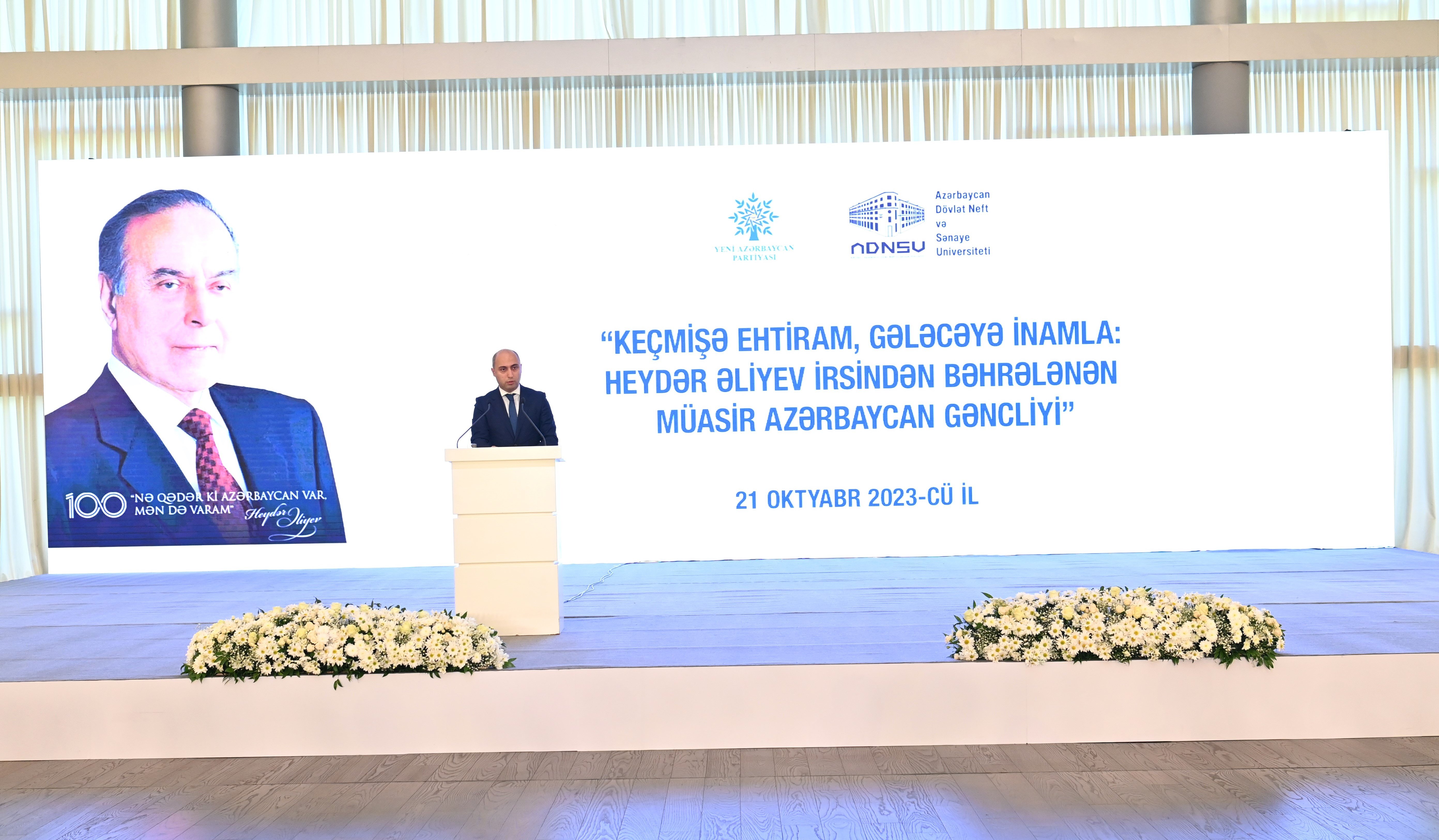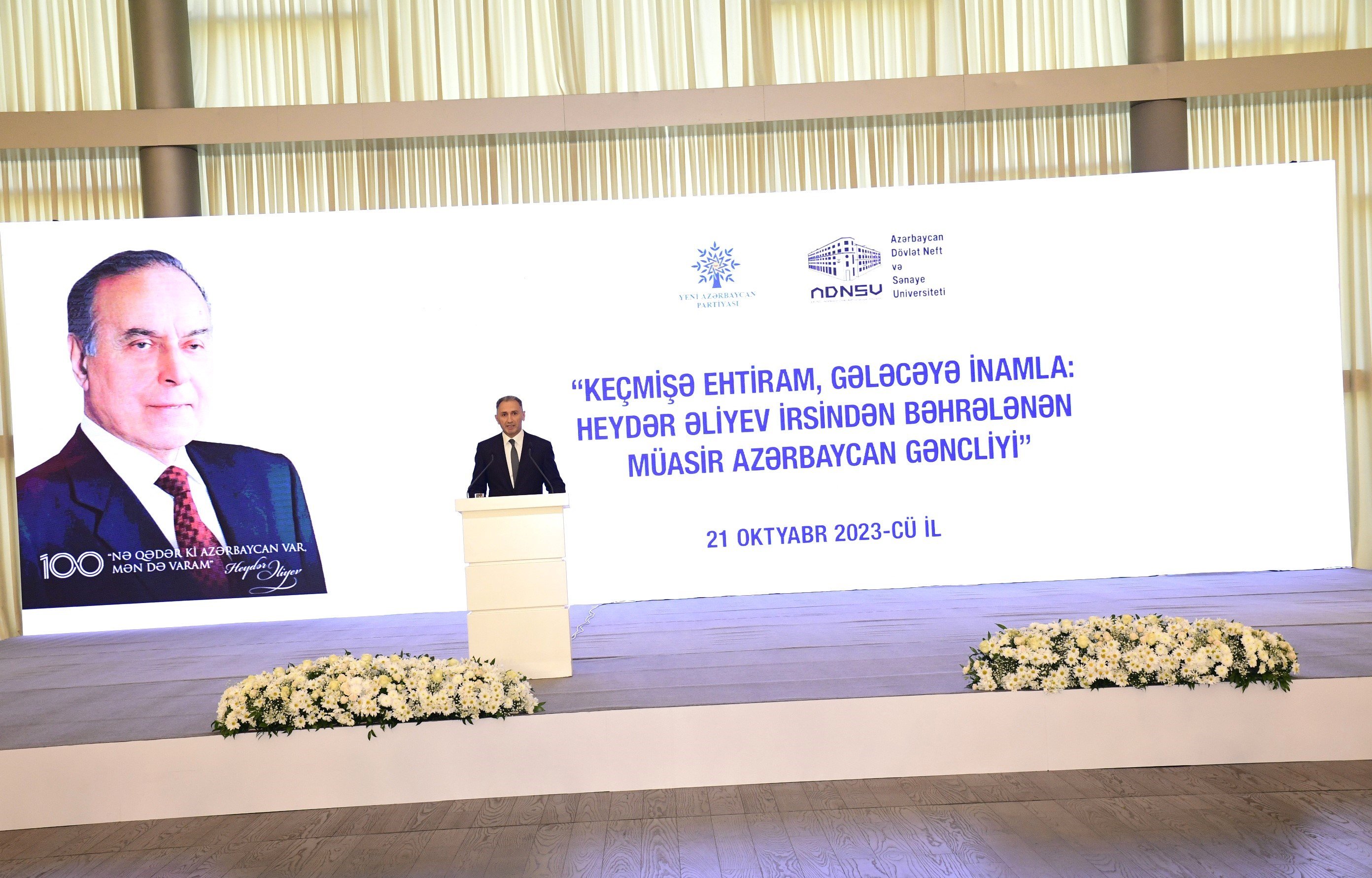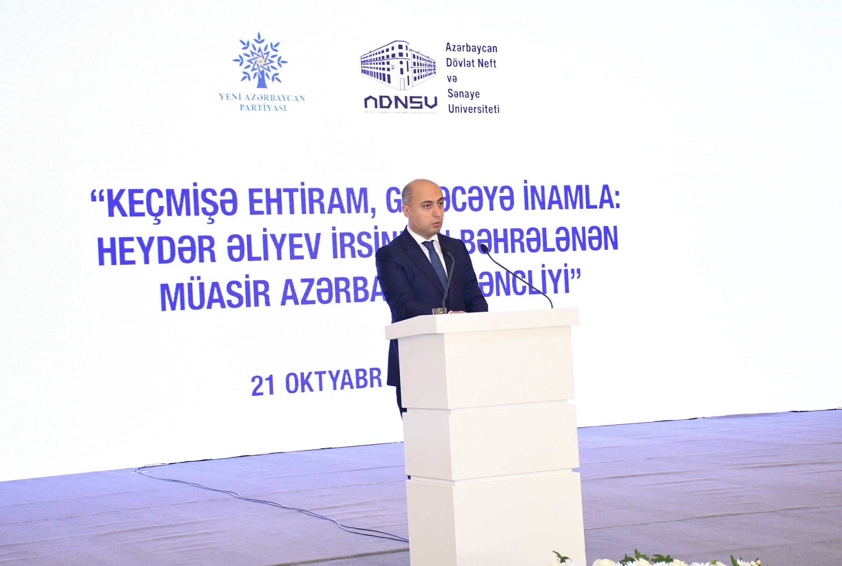 Oktyabrın 21-də Heydər Əliyev Mərkəzində Yeni Azərbaycan Partiyasının (YAP) Mərkəzi Aparatı və Azərbaycan Dövlət Neft və Sənaye Universitetinin (ADNSU) birgə təşkilatçılığı ilə Ümummilli Lider Heydər Əliyevin 100 illik yubileyinə həsr olunmuş “Keçmişə ehtiram, gələcəyə inamla: Heydər Əliyev irsindən bəhrələnən müasir Azərbaycan gəncliyi” mövzusunda tədbir keçirilib.