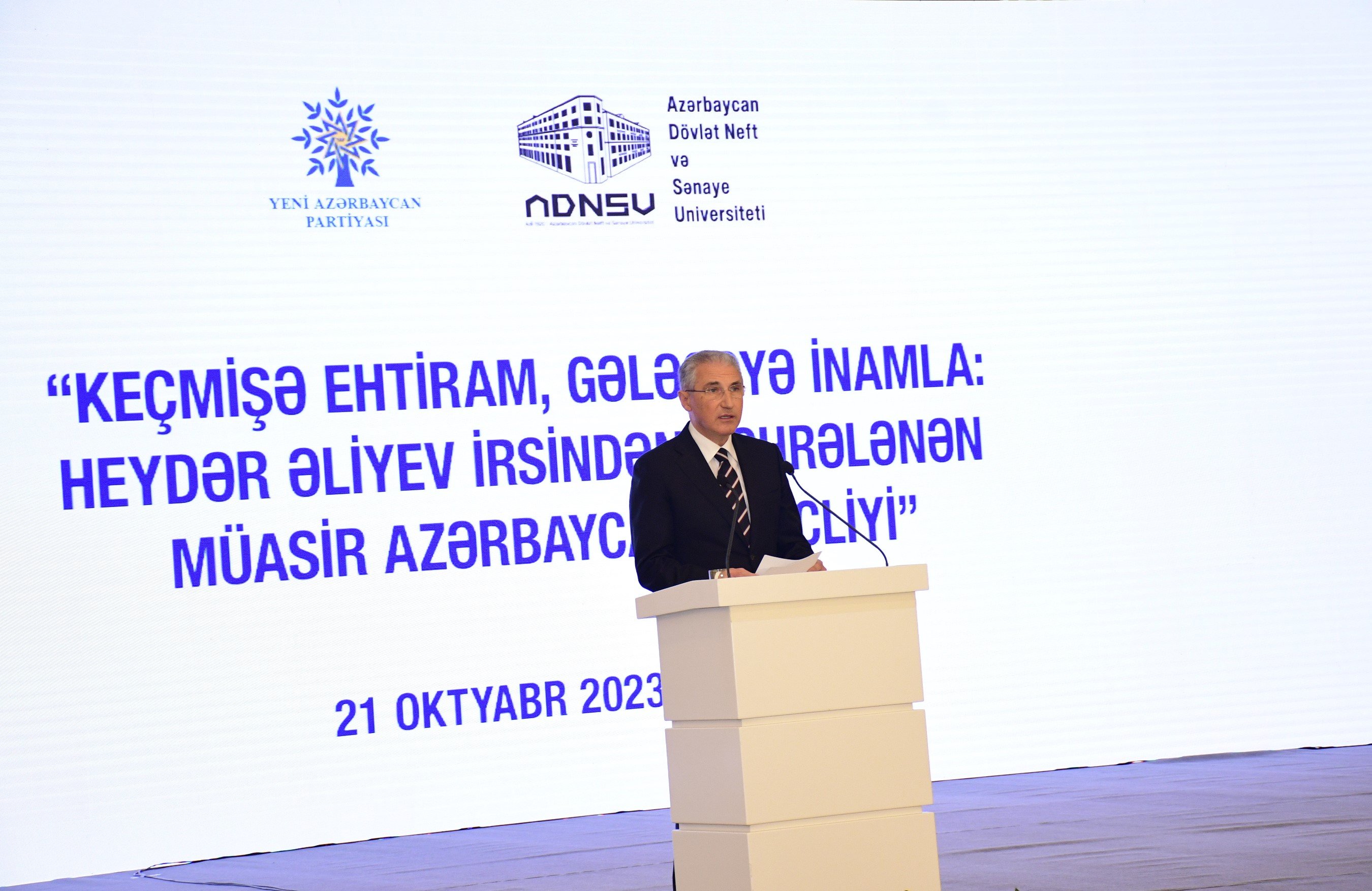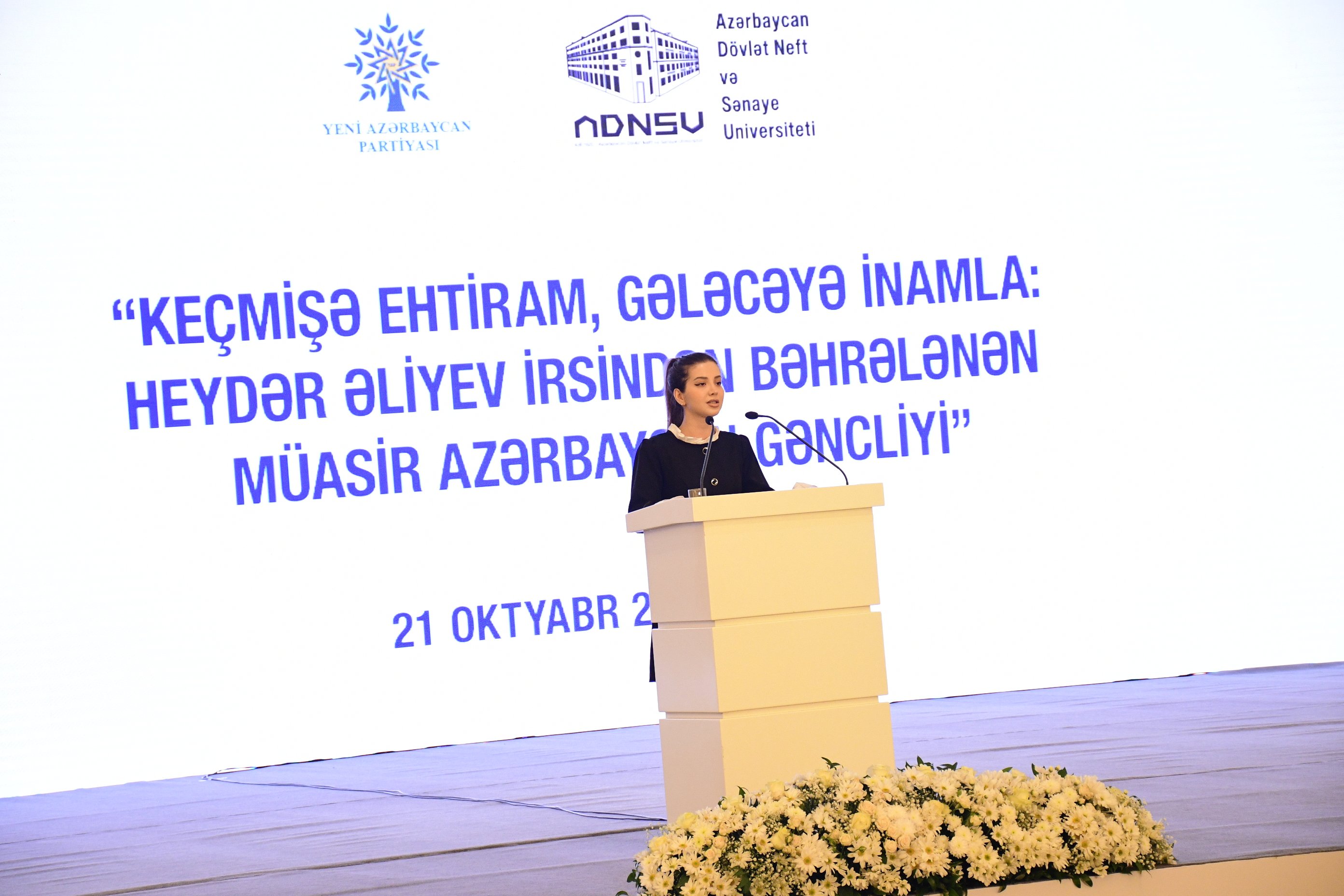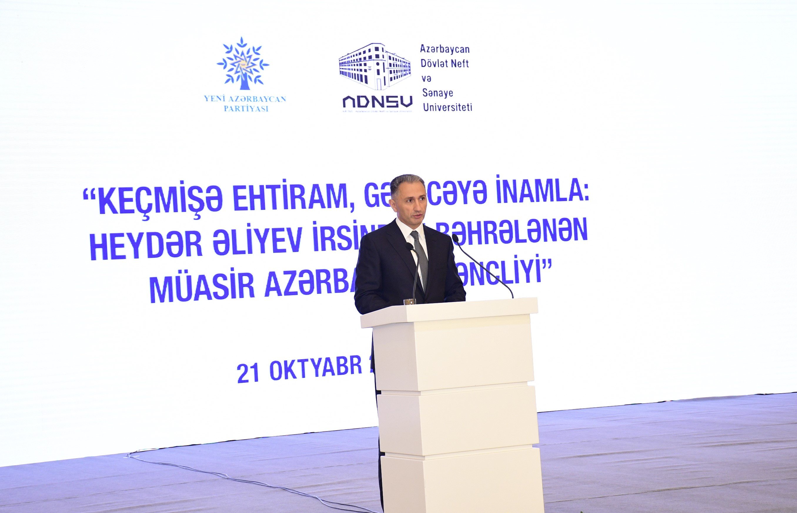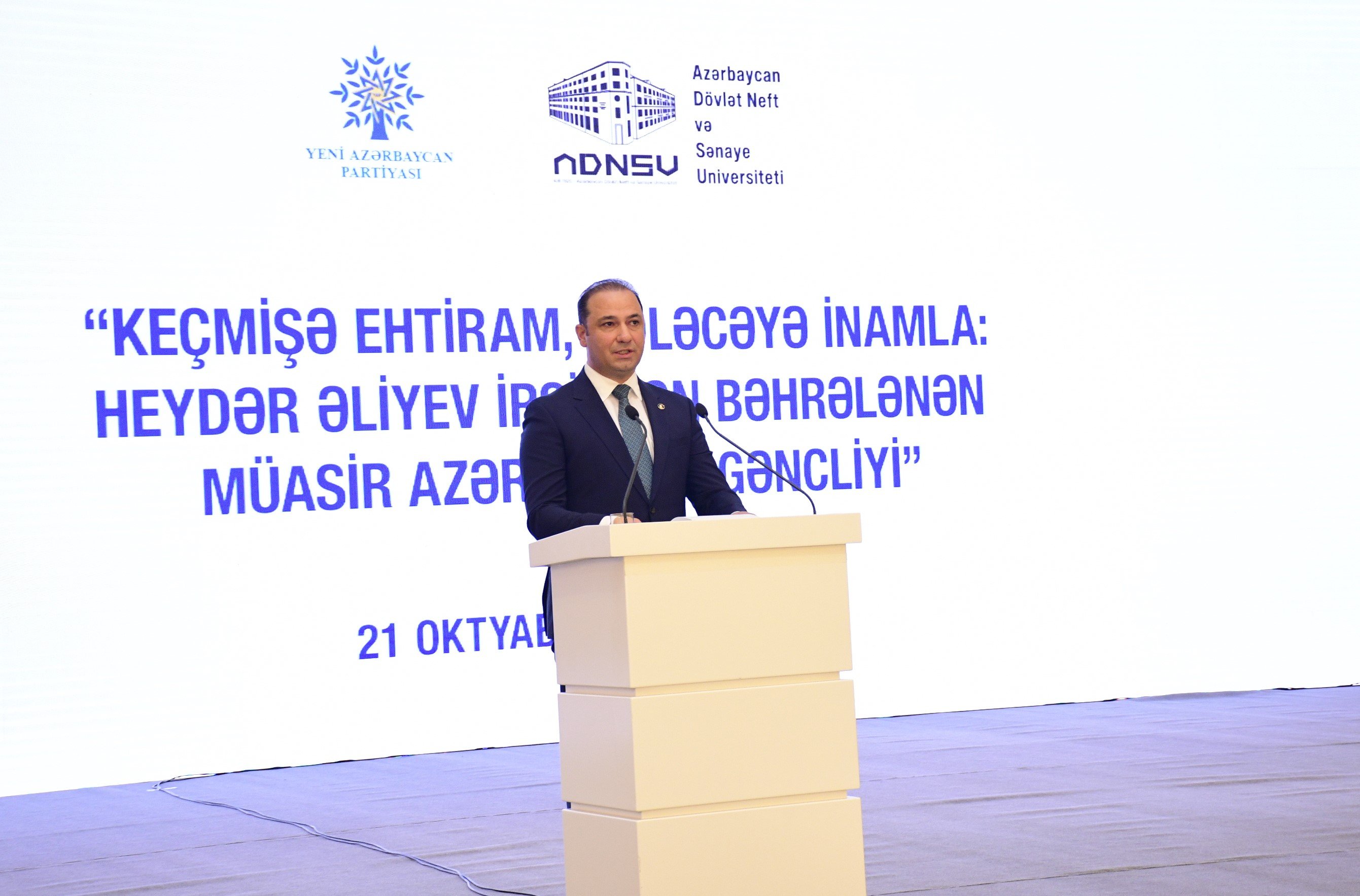 Oktyabrın 21-də Heydər Əliyev Mərkəzində Yeni Azərbaycan Partiyasının (YAP) Mərkəzi Aparatı və Azərbaycan Dövlət Neft və Sənaye Universitetinin (ADNSU) birgə təşkilatçılığı ilə Ümummilli Lider Heydər Əliyevin 100 illik yubileyinə həsr olunmuş “Keçmişə ehtiram, gələcəyə inamla: Heydər Əliyev irsindən bəhrələnən müasir Azərbaycan gəncliyi” mövzusunda tədbir keçirilib.
